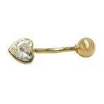 Wunderschöner Piercingschmuck für den Bauchnabel aus 585er Gelbgold (14 Karat), gearbeitet in hochwertiger Juwelierqualität. Das erotische Schmuckstück, ein ca. 6x6mm großer, rund eingefasster Zirkonia in Herzform, befindet sich an einem gebogenen, ca. 1,2mm dicker Stab, an dessen anderem Ende eine glänzende, 5mm große, abschraubbare Goldkugel sitzt. Die Steglänge dazwischen beträgt ca. 9mm. Edler Bauchnabelschmuck für die modemutige und figurbewusste Trägerin.